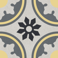 Feinsteinzeugfliese im Format 20x20 cm, inspiriert von Zementfliesen, mit einem modernen Blumenmuster in Grau-, Zimt-, Weiß- und Schwarztönen.